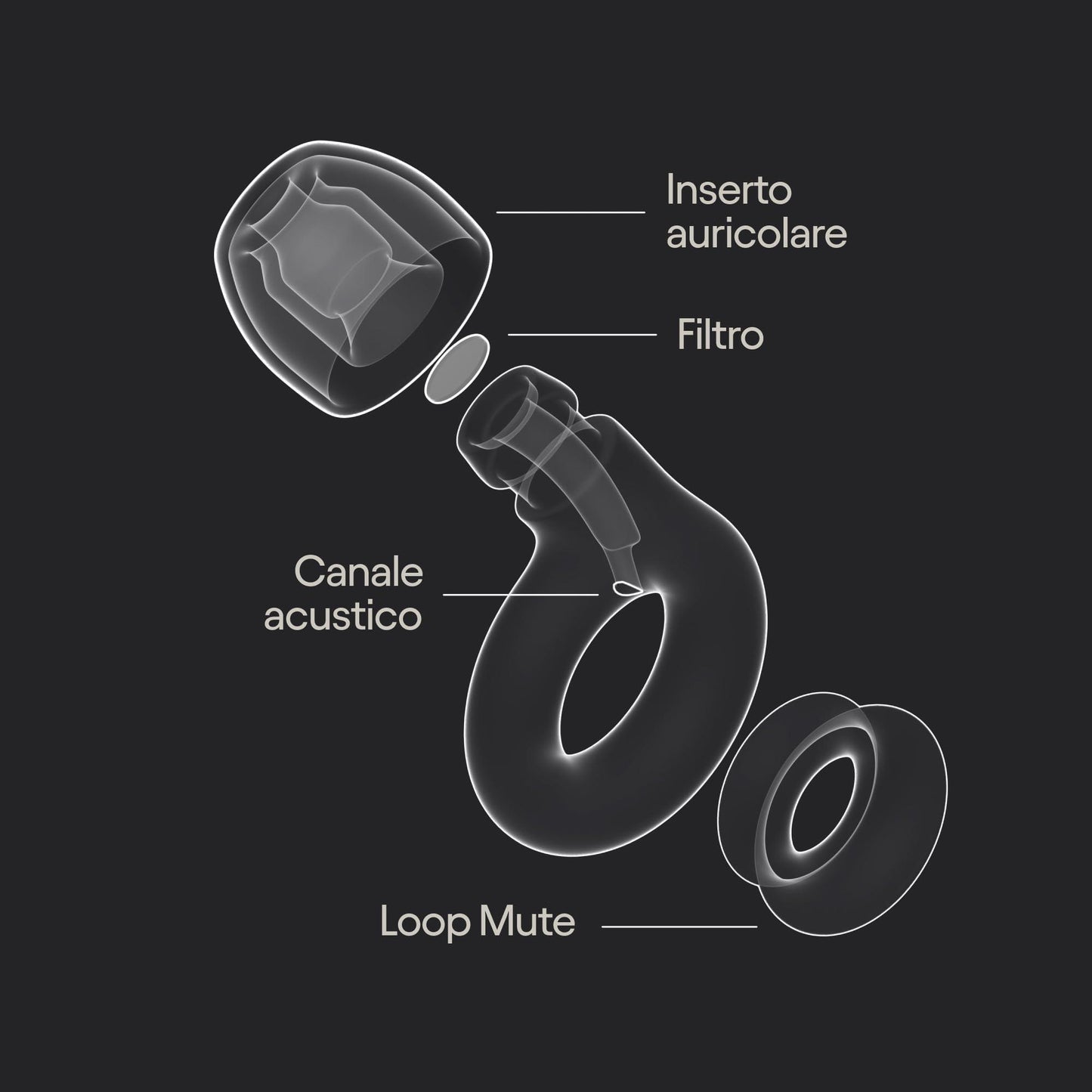 - LA CONFEZIONE CONTIENE: – 1 set van tappi Loop Engage 2 Plus, 2 accessori Mute (1 nero, 1 bianco), 4 inserti auricolari in siliconen (taglie XS + S + M + L), 3 inserti auricolari in schiuma (taglie S + M + L) e 1 praktische draagtas draagbaar per portachiavi.