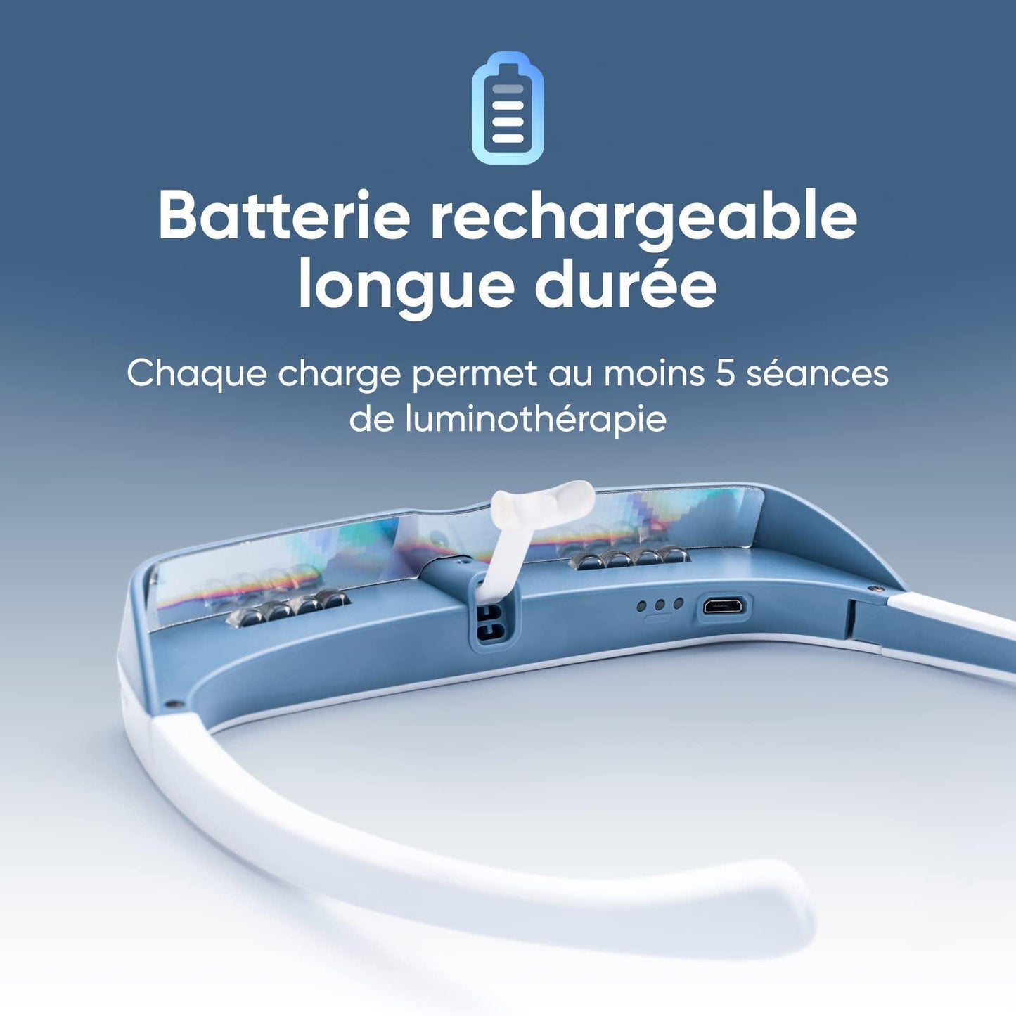- LANGERE AUTONOMIE: Luminette is oplaadbaar via een micro-usb-kabel; één keer opladen geeft autonomie voor 10 sessies. Geleverd met een UK-stekkerlader