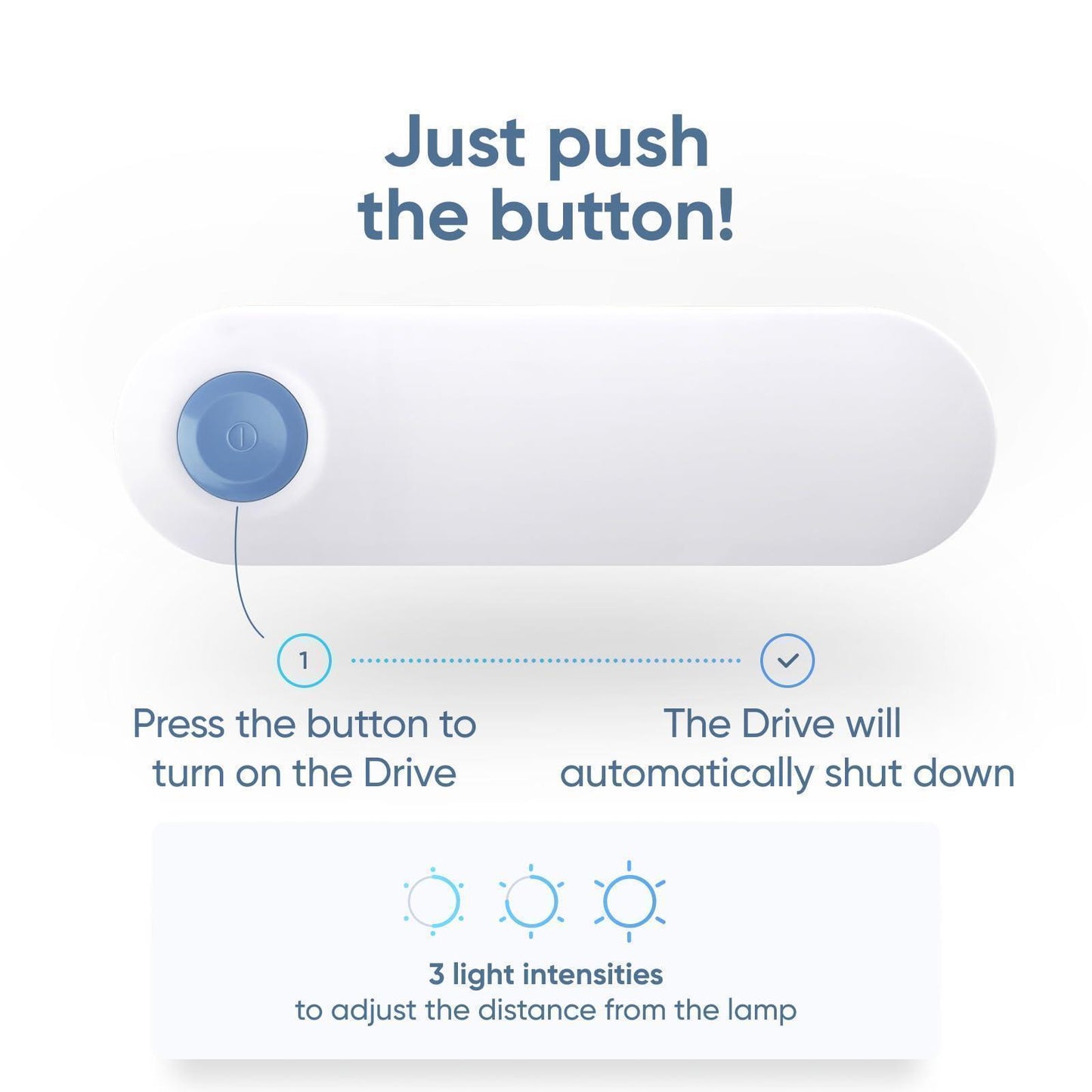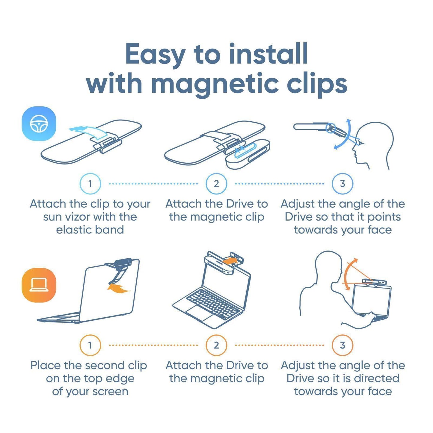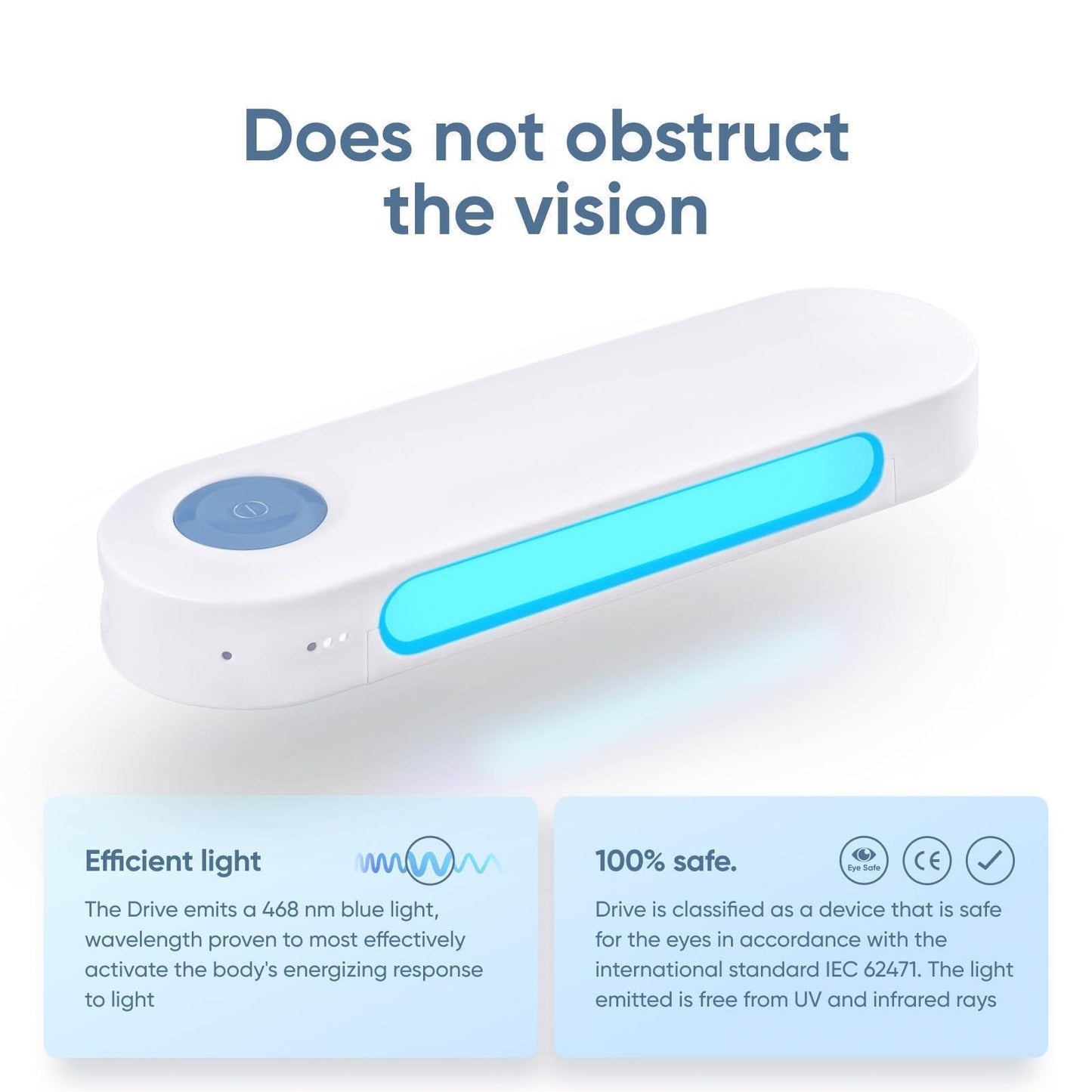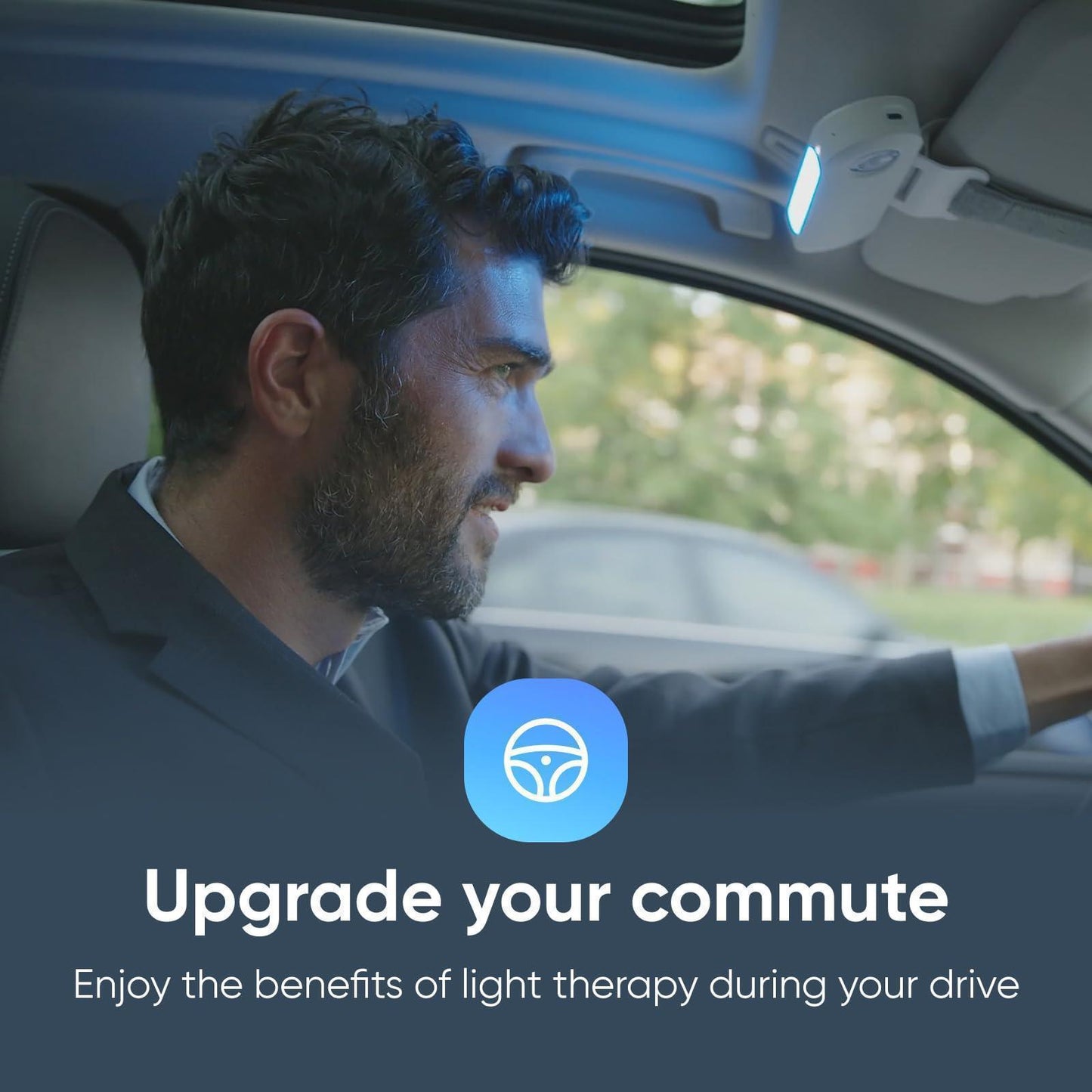 - GEMAKKELIJK TE GEBRUIKEN - Het draagbare lichttherapie-apparaat Drive heeft een elastische band en een magnetisch bevestigingssysteem dat binnen enkele seconden op de zonneklep kan worden geplaatst. De verlichtingshoek is eenvoudig aan te passen en het apparaat schakelt na 20 minuten automatisch uit om te worden opgeborgen tot het volgende gebruik.