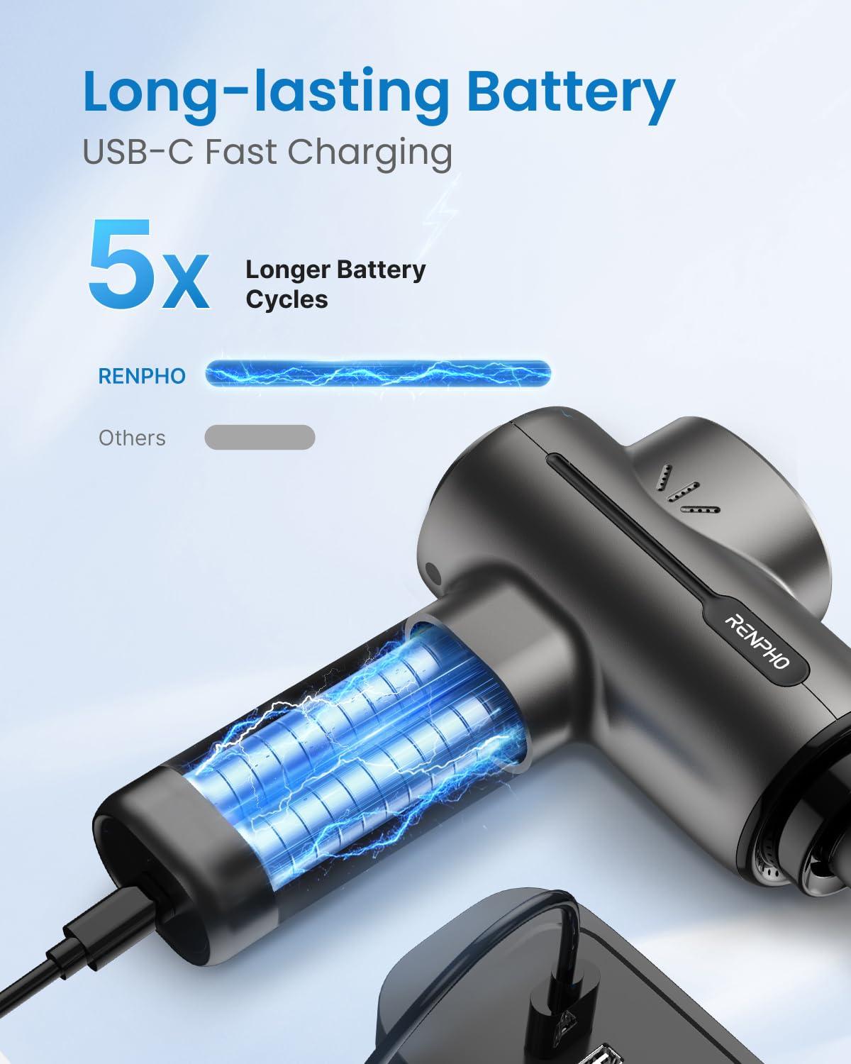 - SUPER HANDIGE TYPE-C OPLAADPOORT: U hoeft de oplaadkabel nergens mee naartoe te nemen als u op reis bent of gewoon uitgaat! Dit Renpho deep tissue spiermassagepistool is ontworpen met een type C oplaadpoort en kan worden opgeladen met de meest populaire type c kabel via een gewone telefoonadapter of een 5V/2A adapter zoals een powerbank.