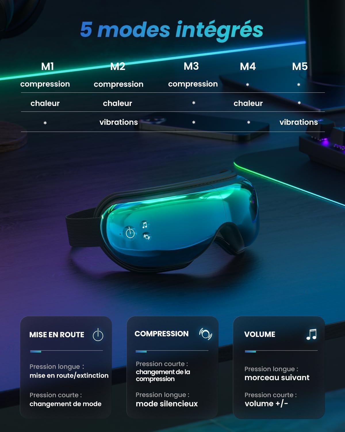 - Muziek die via Bluetooth kan worden gepersonaliseerd - Geïntegreerde hogere parleurs en een pre-registratie verbeteren de ontspanning. U kunt een verbinding maken via Bluetooth om uw eigen lezingslijst te bekijken. De muziek vermindert uw angst en de fysieke effecten van stress, u zult zeker een goede prestatie hebben. Nom Bluetooth: oculaire masseur.
