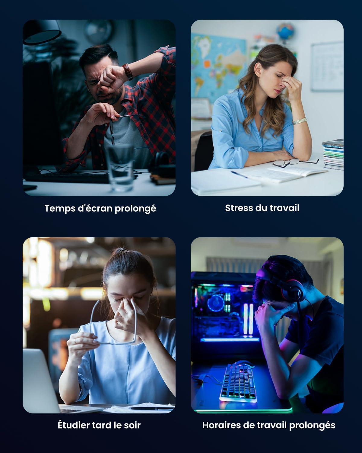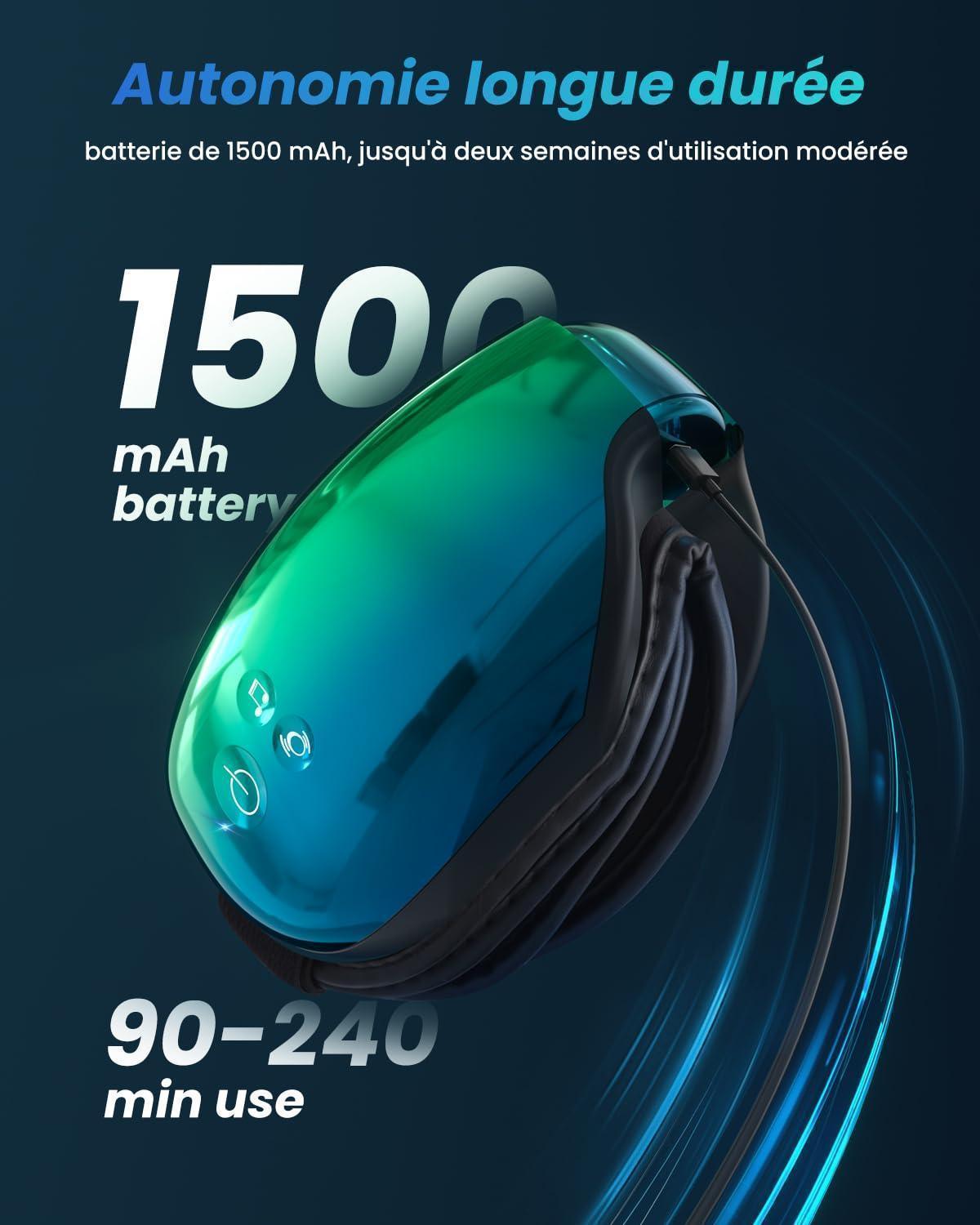 - Massage chauffant confortable - Les coussins chauffants integreert de oculaire masseur Renpho viernissent een temperatuur comfortabel tussen 104 - 113℉ (40 ℃-45 ℃), en zorg ervoor dat de poches oculaires ontspannen. Een compressie die de metabolische werking van uw lichaam regelt, verbetert en werkt de symptomen. Opmerking 1: Nous déconseillons aux clients d'utiliser des machines pour les yeux s'ils on subi one operatie des yeux, een genegenheid van het hoofd, een cataract, een glaucoom, enz.