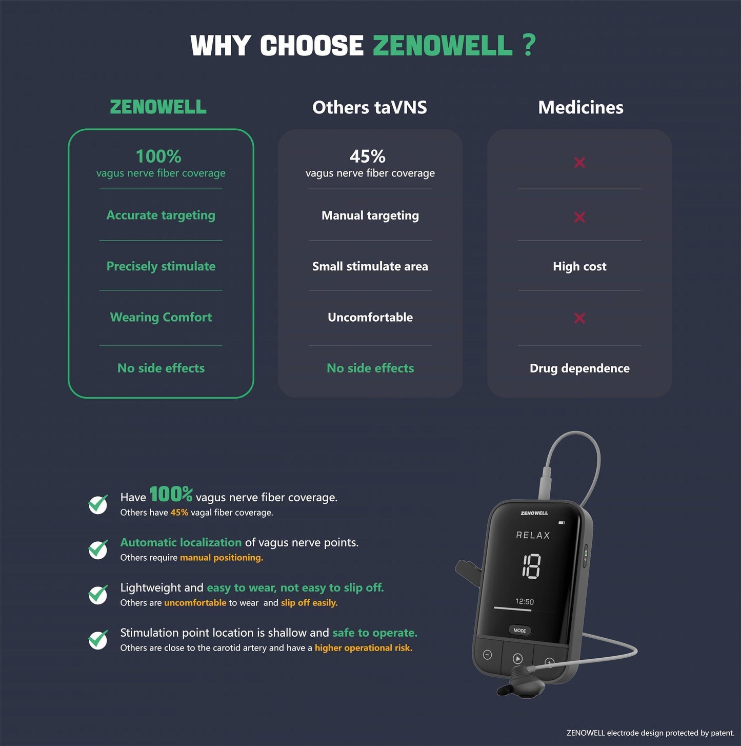 - [Gepatenteerde auriculaire nervus vagus stimulatie] - De auriculaire tak van de nervus vagus is de enige tak op het gehele lichaamsoppervlak. De gepatenteerde nervus vagus stimulator van ZENOWELL activeert het parasympathische zenuwstelsel, brengt het autonome zenuwstelsel in evenwicht en reguleert fysiologische en psychologische toestanden.