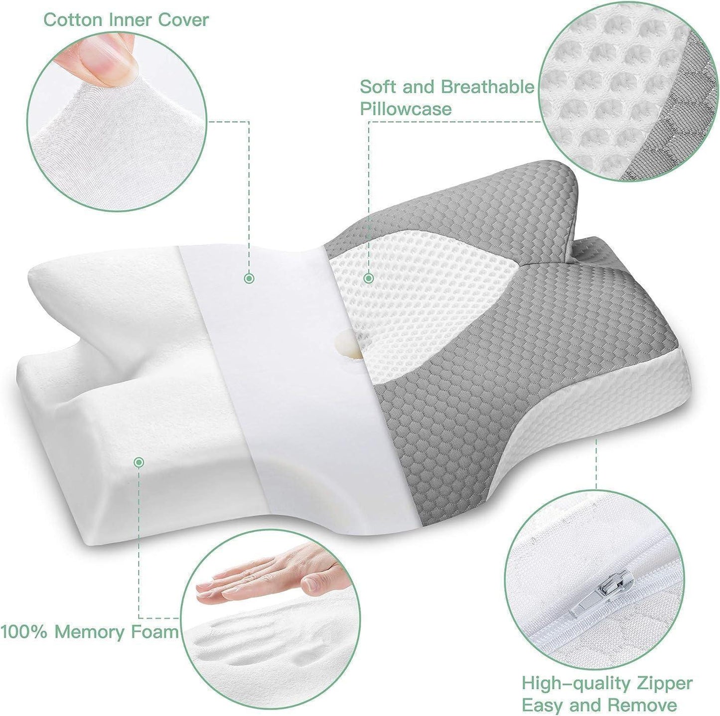 Elviros Cervical Contour Memory Foam Pillow for Neck Pain Orthopedic Neck Pillow for Shoulder Pain Ergonomic Head Neck Support Pillow for Side/Back/Stomach Sleepers with Removable Cover (Grey)