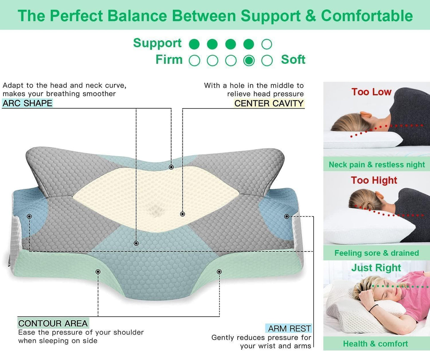 - ERGONOMIC DESIGN: Elviros contour pillows are well designed to support by following the natural curve of your body keeps air passages optimal for less snoring and more restful sleep. The cutouts on the side give your top arm a place to rest and keep it at an angle so your shoulder is not hunching over in front of you